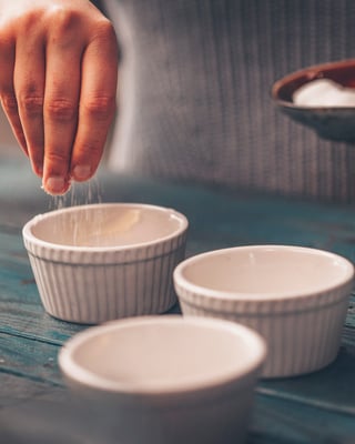 Streng genommen ist euer Schokoküchlein nur ein Schokoküchlein, wenn er in einer Souffléform gebacken wird. Da aber niemand Klugscheißer mag, sagen wir euch: Wenn ihr nur eine Muffinform zuhause habt, könnt ihr die natürlich auch verwenden. Disclaimer: Eine Muffinform ist deutlich kleiner als ein Schälchen für Soufflé. Ihr versteht, dass das bedeutet, dass auch die Küchlein aus einer Muffinform kleiner sind und ihr eventuell lieber zwei essen wollt. Auch die Backzeit verkürzt sich, aber dazu kommen wir gleich noch. Übrigens: Vergesst nicht, eure Form mit etwas Butter einzufetten, damit sich die Küchlein entspannt aus den Förmchen nehmen lassen.
